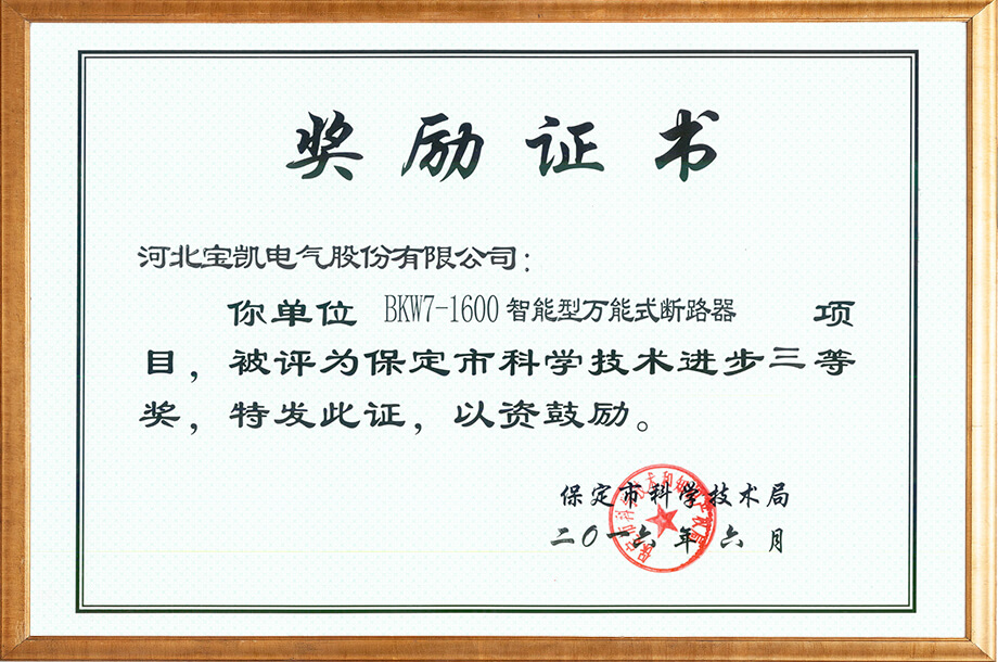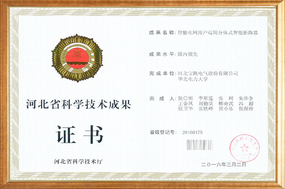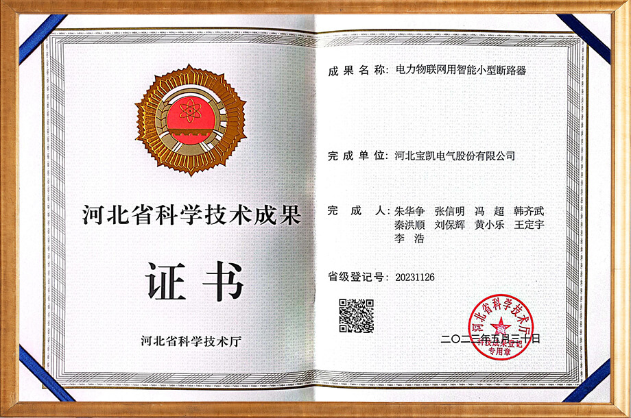 电力物联网用智能小型断路器-科技成果证书