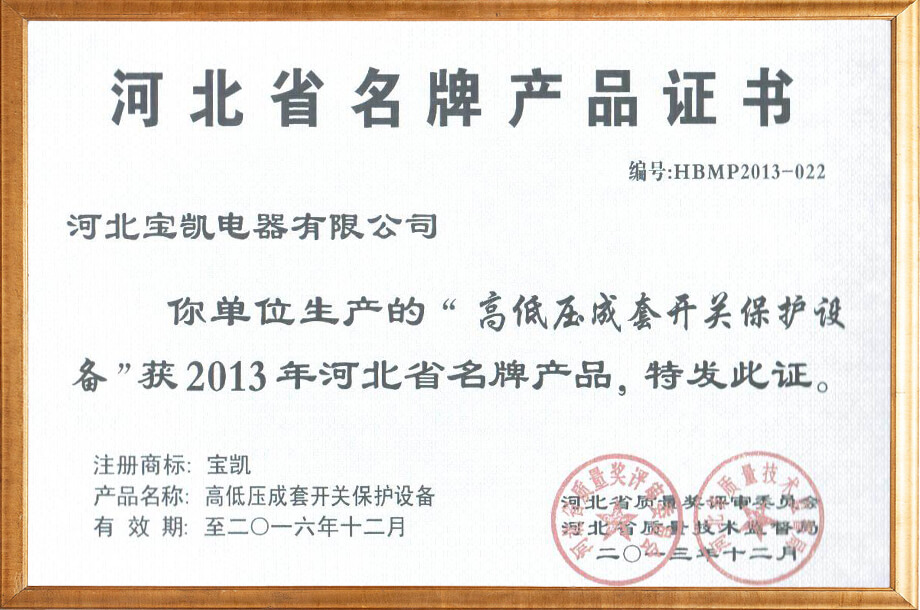 河北省名牌产品证书